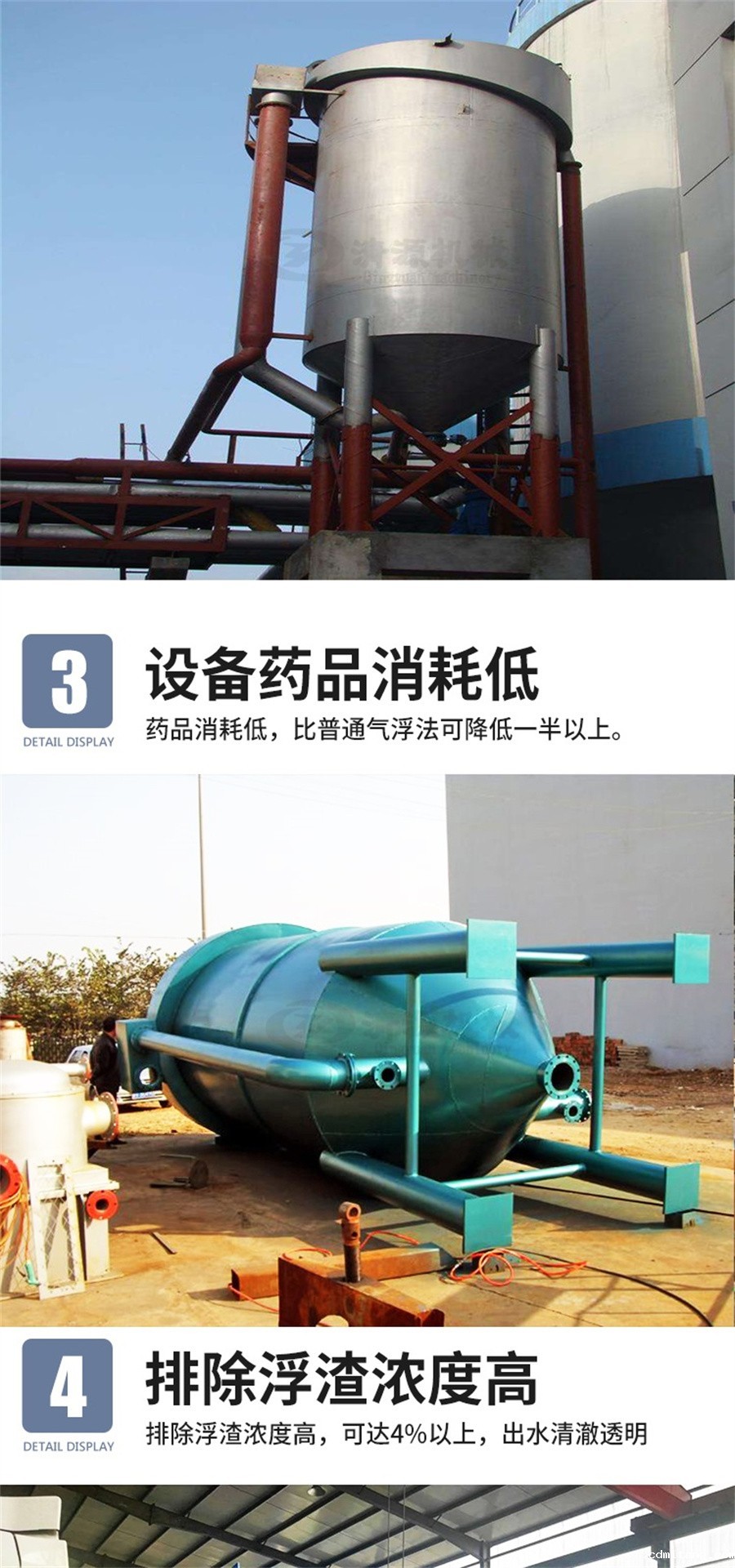 该设备结构紧凑,小型化、占地面积小:如日处理1000-4000平方厘米纸机白水量,该设备高度仅5.5米,占地10平方米,完全可以按照车间内部。 动力消耗小,比普通气浮可降低50%以上。 药品消耗低,比普通气浮法可降低50%以上。排除浮渣浓度高,可达4%以上,出水清澈透明,SS去除率达96%以上,非容性COD可全部去除。