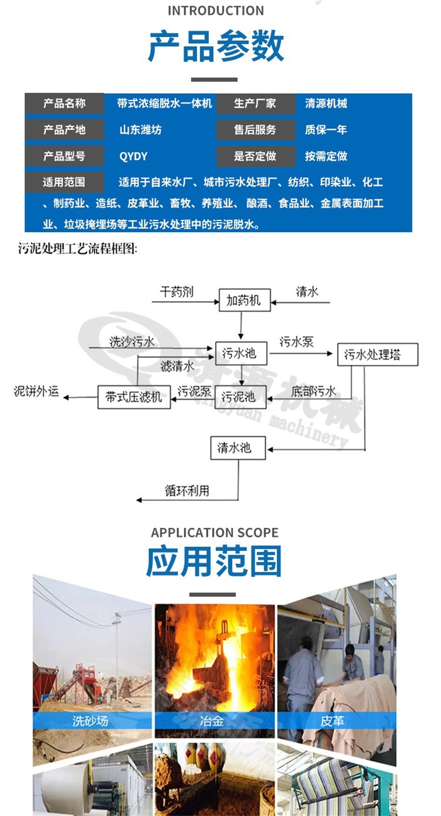 三、应用范围:适用于自来水厂、城市污水处理厂、纺织、印染业、化工、制药业、造纸、皮革业、畜牧、养殖业、 酿酒、食品业、金属表面加工业、垃圾掩埋场等工业污水处理中的污泥脱水。
