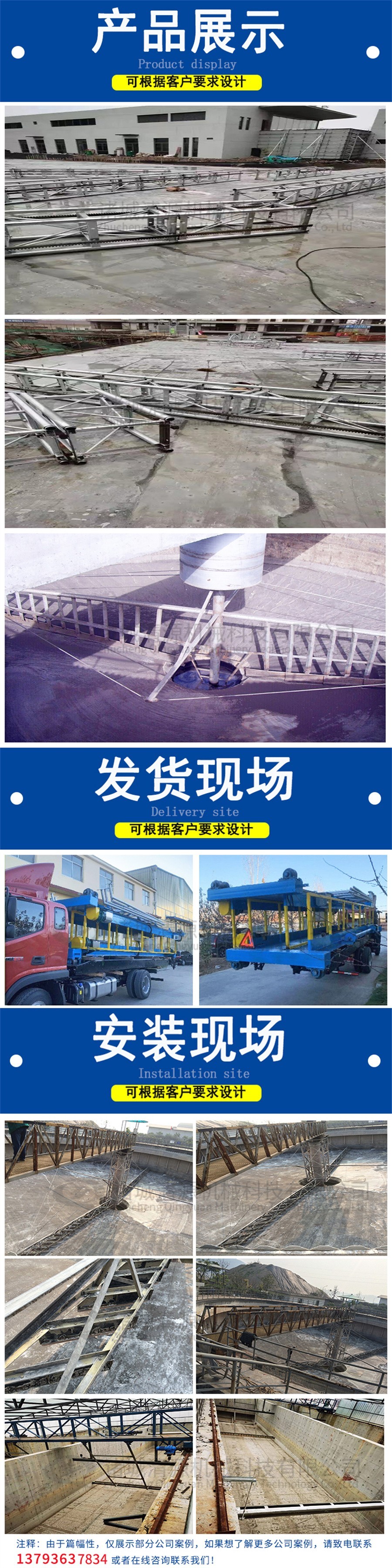 工作桥由安装在周边的驱动机构带动,绕安装在池中心支墩上的中心支座旋转,安装在工作桥上的一组刮泥板在旋转过程中,将沉淀在池底部的污泥刮向池中心的积泥坑。同时,液面上的浮渣在浮渣刮板和周边挡渣堰形成的渐缩区域内集中,有浮渣刮耙扒到集渣斗,排至池外。