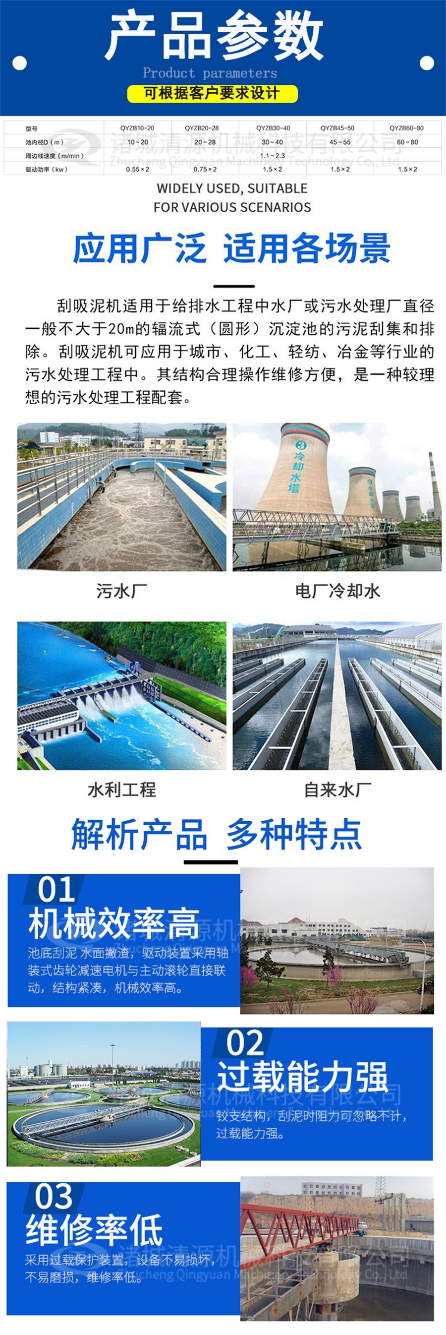 全桥式周边传动刮吸泥机用于污水处理厂、自来水厂以及工业废水处理中辐流式沉淀池。将沉降在池底的污泥刮集到池底的集泥坑,池面的浮渣被撇向管式排渣斗。