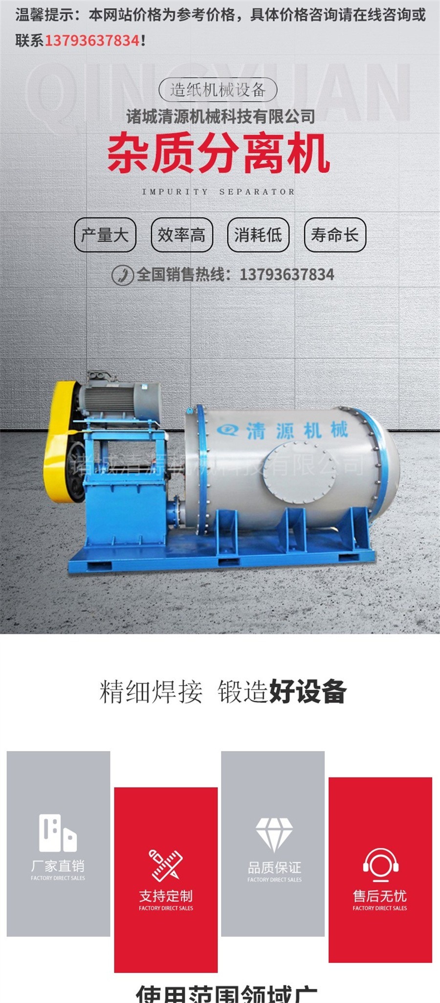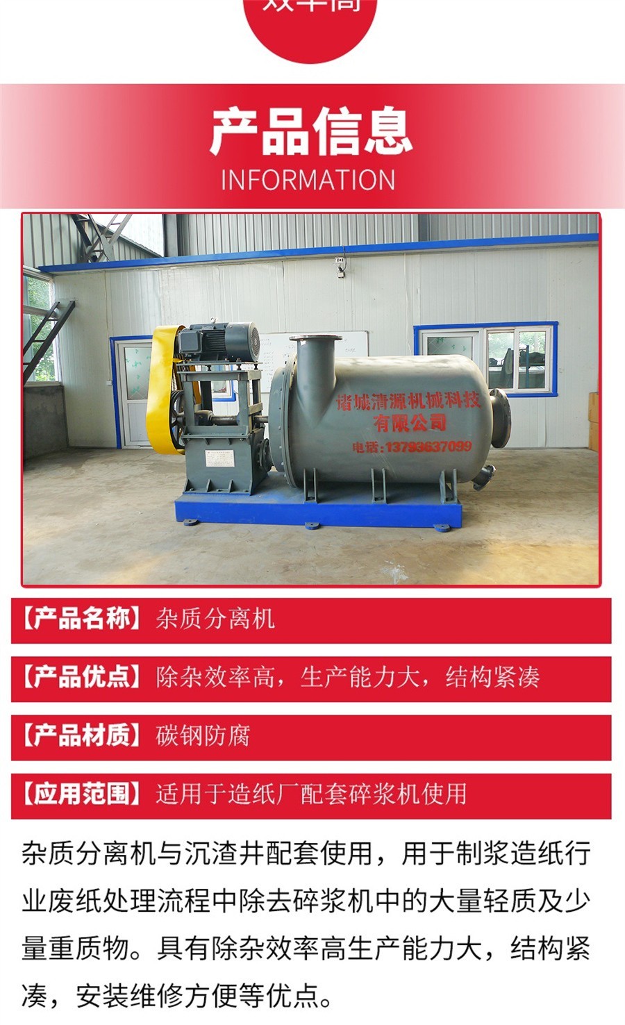 杂质分离机内有特别设计的低摩擦叶片水力型转子,能使进入的浆料均匀分散,保持筛板不阻塞并防止杂质破碎。轻杂质经粗选机顶部出口排出,进入圆筒筛进行进一步的分离,重杂质经粗选机的底部排出,除杂后的浆料经过后部筛板由出浆管送出。